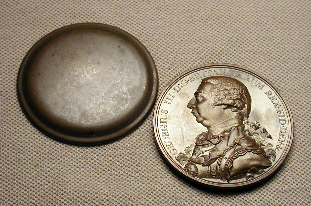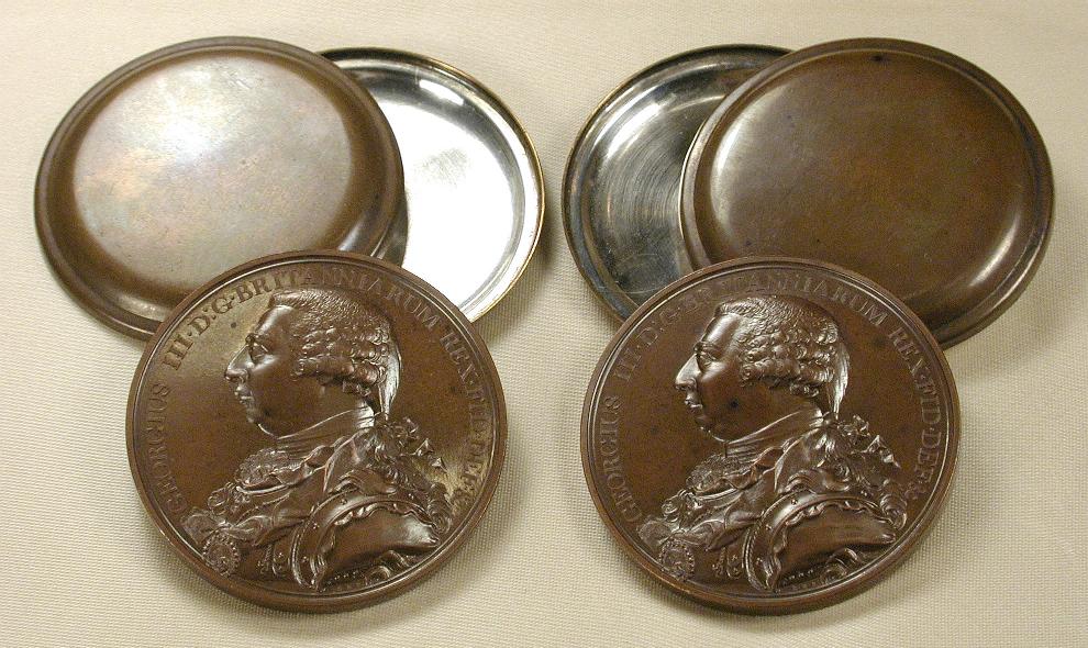 These medals were produced by the Soho Mint and held in the personal collections of the Boulton family. A sketch of how they came to be in my collection will be found in the introduction to the Death Medal page, page 1. As time passed, some medals were duplicated in the collection as more were found by the family. Those medals were purchased by me and those re-sold or (previously) for sale are listed below. Photography by Eric Holcomb Medals purchased and re-sold. All Boulton family holdings. PREVIOUSLY FOR SALEThe above medal is one produced by Matthew Robinson Boulton as a commemorative ten years following the death of his father, Matthew Boulton. The pieces with lettered edge and gilt interior to the copper shells were all pieces that were given to family members. Other than the Boultons, only the James Watt family received gilt shell pieces. See the Death medal page. Was This family owned medal was offered at $3800, with a letter of provenance. The piece below, with no shells but with the rare lettered edge, was offered at $1750, SOLD 2007. also with a letter of provenance. It is estimated that 75-100 pieces were prepared with lettered edges. Both medals are in very nice condition. The Copper Corner collection to date owns all of the family owned death medals held by them, and three of the four given to the Watt family. It has been decided to sell a few of them. Above: 49 mm medal by Kuchler. The piece on the left is pristine, in shells and inscribed paper wrapper, "Last Interview of Louis XVI", with the obverse Louis XVI and Marie Antionette, the reverse showing the king saying goodbye to his family. The medal on the right is the second in the series of three, Marie Antionette on the obverse, and the reverse showing her execution. The second medal is quite damaged from dampness. The "Last Interview" was for sale, with a letter of provenance, for $2200, and the second piece was included at no extra charge. Both, however, were in the Boulton holdings. SOLD 2008. Above: A White metal medal -- 48mm by Kuchler. Bust of Nelson/scene of the battle of Trafalgar. In the original box. This one dampstained, but the surfaces, save a couple small patches, have remained nice. The edges, especially on the reverse, have the tinning off due to the dampness, and the case is usable but obviously dampstained. The edge of the medal reads "To the heroes of Trafalgar from M. Boulton", and was released in 1805 after the battle, and Nelson's death. Boulton put away a few of these, this one given to another family member who did not take good care of it. I have sold a couple of these, in perfect condition (see below) for $5500, this one was available with the letter of provenance for $1000. SOLD 2007. Above: Made for Monneron, in France, 1791. Acceptance of the Constitution of Free France. Obverse: The Constitution of Free France. Reverse, the acceptance of it on 13 September 1791. This piece very rare above Fine, or so I am told by French collectors. Completely uncirculated, but with some roughness in the fields especially due to dampness. 36mm. A very high grade example and nearly unknown as such. Ex Boulton family, sold with a letter of provenance, at $950. Above: An unfinished die used to stamp this piece, which in it's finished state reads "Staffordshire Agricultural Society", and Britannia is holding a wreath. this one simply not completed when the trial was struck. About 1806. Some dampstaining. From the Boulton family, with a letter of provenance, was offered at $350. SOLDPowers of the Soho Mint. 43mm original striking, with original tissue wrap. Obverse, Bust Matthew Boulton. Reverse, a chronological listing of the progress the mint had made over the years. In French, it was struck to refute Droz's claim to having made the improvements to the Soho mint himself. Struck in French. This medal purchased from Boulton agent Tim Millett in October 2002. Sold 2006. Powers of the Soho Mint. 43mm original striking, with original tissue wrap. Obverse, Bust Matthew Boulton. Reverse, a chronological listing of the progress the mint had made over the years. In French, it was struck to refute Droz's claim to having made the improvements to the Soho mint himself. Struck in French. This medal purchased from Boulton agent Tim Millett in 2002 by Allan Davisson. Purchased from Davisson in 2005. Sold 2006. Boulton's Trafalgar Medal. White metal. 48mm, by Kuchler. In soft box of issue. Obverse, Bust of Nelson. Reverse, view of the battle of Trafalgar. "England expects every man to do his duty". The edge is inscribed "To the Heroes of Trafalgar from M. Boulton". Matthew Boulton gave each man who served with Nelson at Trafalgar a copy of this medal. This particular example has been in the Boulton family holdings until I received it in 2003 from Tim Millett. It has had no handling whatsoever in the last 200 years, and is simply above exceptional!! Ex Boulton Family. This one sold 2003. The Boulton family released three of these amazing "as new" white metal Trafalgar medals. Two had "soft" boxes, one had tin shells of a type used in the 1805 period. See next for the only one released with shells. Boulton's Trafalgar Medal. White metal. 48mm, by Kuchler. Tin presentation shells, of the type used in 1805. Original striking, as are all. Description as above medal. This particular example has been in the Boulton family holdings until I received it in 2005 from Tim Millett. It has had no handling whatsoever in the last 200 years, and is simply above exceptional!! Ex Boulton Family. In the original tin shells and paper wrap. As new, with letter of provenance from the holdings of Matthew Boulton. Sold, 2007. George III Death Medals. BHM 991. Bronzed copper. By Kuchler. 48mm. Original strikings, 1820. In presentation shells. EX: Matthew Robinson Boulton holdings. These are no longer in my collection. Purchased from Tim Millett, one in 2002, the other in 2003. Sold 2003. George III Death medal with single shell BHM 991. Bronzed Coppe