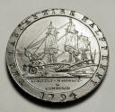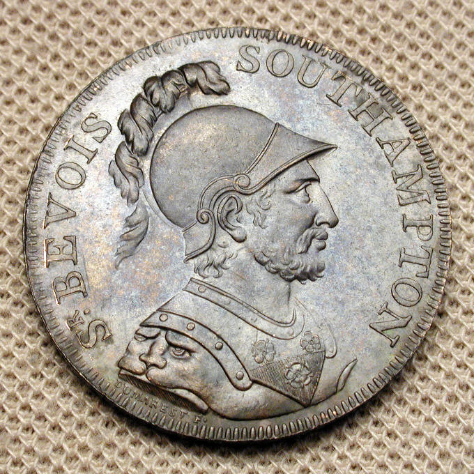 This page contains tokens from the "Conder" era, 1787-1804 that were produced by the Soho mint. Unless otherwise stated, each piece pictured came from the Boulton or the Watt family holdings. Photography by Eric Holcomb This group, to be expanded, contain tokens that were owned by the Boulton family, and purchased from them through their agent Tim Millett. All will be identified by their catalog number in Dalton and Hamer's "Provincial Token Coinage of the 18th Century". Pictured, Top Left Cornwall #2, 1791. Top Right, Hampshire 89, 1791. Second row, Warwickshire 289, 1792. Second row right, Hertfordshire Stortford #4. Some tokens from the Boulton Family holdings. From top left, Cornwall D&H 2, Druid/Shield. Hertfordshire 4, Shield/View of the River Stort. Middlesex, Ibberson's halfpenny, St; George and the Dragon/Mail Coaches &c. Yorkshire 34, Bishop Blaze/Leeds Cloth Hall. Wicklow halfpenny, Bishop's head/Miner's arms. White Metal Tokens, Commemorating George III's return from madness, 1789. EX: James Watt Jr. holdings. Morton and Eden, Nov 2002, Lot 212 (part). Purchased at the sale. Over a period of years from 2002-2004 a number of tokens have been sold. A few of them are to be viewed in the "montages" of tokens from 2002 and 2004, and others not pictured that were obtained in 2003. A few of the other tokens that have been sold are pictured here as well. All of them were in the Boulton Family holdings. Montage of Tokens struck at the Soho Mint. This group obtained 2002. The above montage is of 14 tokens found in a "roll" of tissue (pictured to the right) that were released by the Boulton family. Purchased October, 2004 from Boulton agent Tim Millett. The tissue roll is being saved, and some of the tokens from the roll will be placed in my collection, with the rest for sale. The roll contained one Hampshire 89, three Cornwall, and one Stortford token, along with eight Warwickshire, Wilkinson 389 tokens, and one counterfeit 1793 "Wilkison" issue, so far the only non-Soho token found in the Boulton holdings. The above token from Scotland, Lanarkshire D&H 2, is from the James Watt Jr holdings, and were lot # 293 (10 tokens) in the Morton and Eden sale of November 13-14, 2002. They were re-offered as lots 771(4 tokens) and 772(5 tokens) at DNW, London, 7 October, 2004. The nine remaining pieces were purchased by me at that time. Ex James Watt family holdings. New Acquisitions from Boulton family, 2007Intro ... Three more tokens were released by the family in the 2007 grouping. The top piece, with one shell, is a Ireland, Wexford Enniscorthy #2. The rarest of the four of the type. The photo does not do justice to this proof token. The two bottom photos are of Hertfordshire, Stortford 4 examples. This was one of the Boulton family's favorites, and some were kept on hand to pass out to potential customers. One of the pieces is very nice, the other slightly dampstained. The tokens pictured below did not belong to the Boulton or Watt families, but are Soho mint products of a quality that deserved to be represented in the collection. Kings Island (Ireland) Charleville, D&H 1. 13 pence. Gilt Proof. 1802. This piece is one of a very few gilt proofs of this interesting token produced. This piece was not part of the family holdings, but was from Soho. Interesting and rare. Non-family owned tokens struck at the Soho Mint. On the left, the obverse and the reverse of a token struck for Croom's in Scotland, D&H Angusshire 14. On the right, a token struck for Daniel Eccleston, D&H Lancashire 58. |